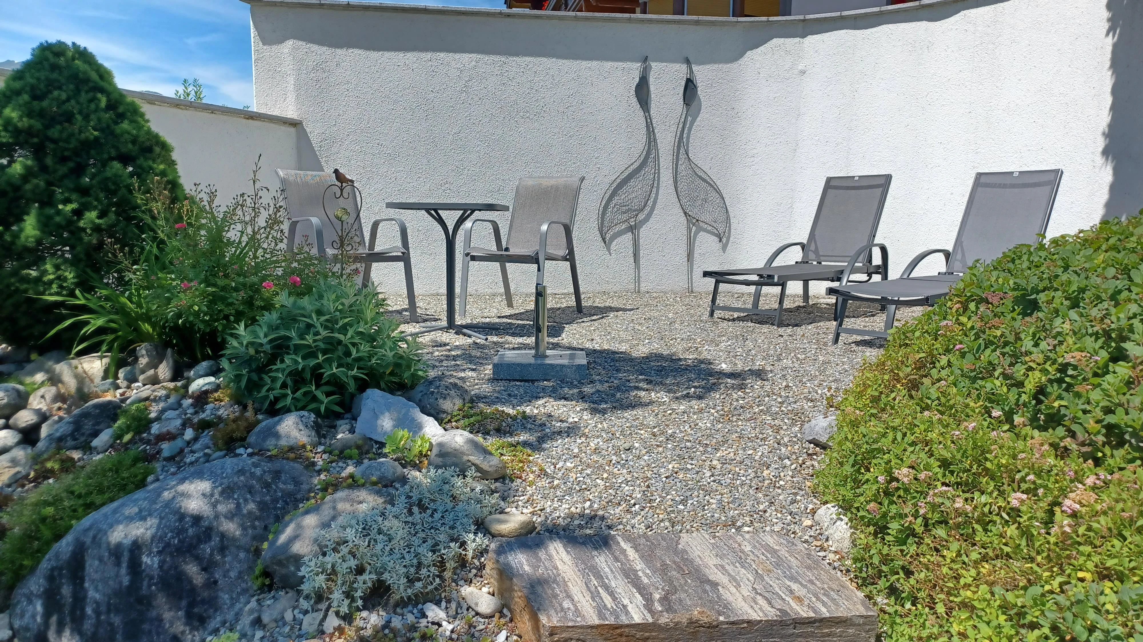 De tuin is geheel afsluitbaar voor kleine kinderen en is voorzien van 3 terrassen met meubilair en biedt een geweldig uitzicht op de bergtoppen zodat iedereen kan kiezen voor rust, zon of schaduw naar behoefte.
