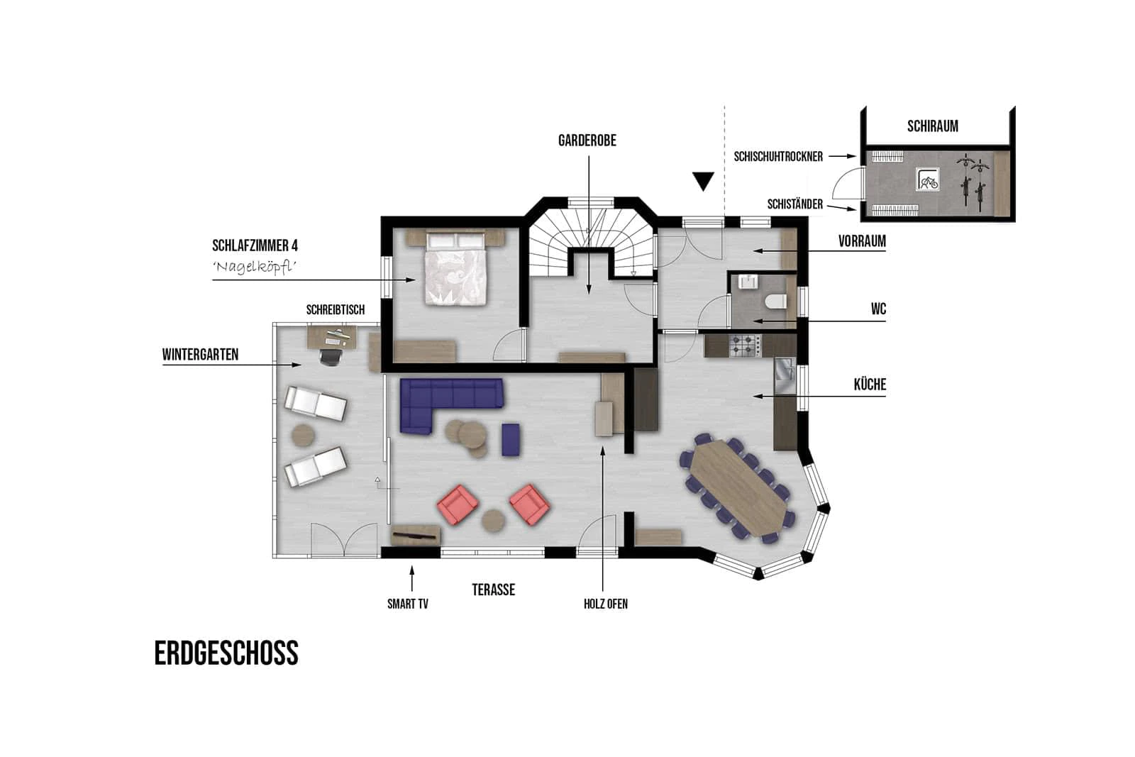Het Chalet is modern, comfortabel en sfeervol ingericht met hoogwaardige materialen waardoor het een heel warm en aangenaam klimaat heeft. Op de begane grond beschikt u over een royale woonkamer met liftdeurhaard en een apart eetgedeelte waar u tot 14 personen aan één tafel kunt zitten.